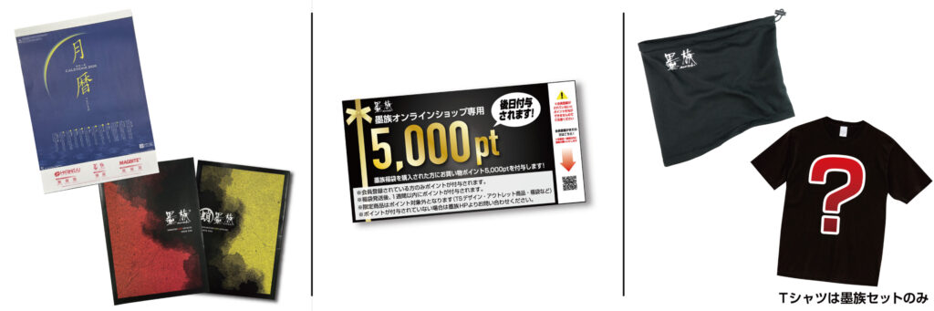 | ①墨族タオル ②墨族ステッカー3種 ③墨族エコケース(カラーランダム) |
