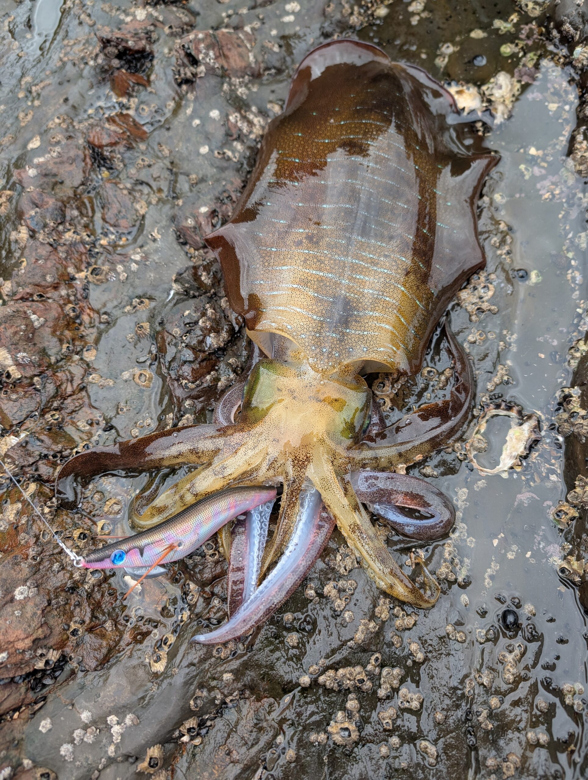 や〜あけでエギングへ。開始すぐは潮位も高く堤防をランガン、型が上がらず干潮前のタイミングで地磯へ移動。 活性の高いイカ達をキビナゴレインボーでランガンし、マックス900㌘でしたが、楽しめました。