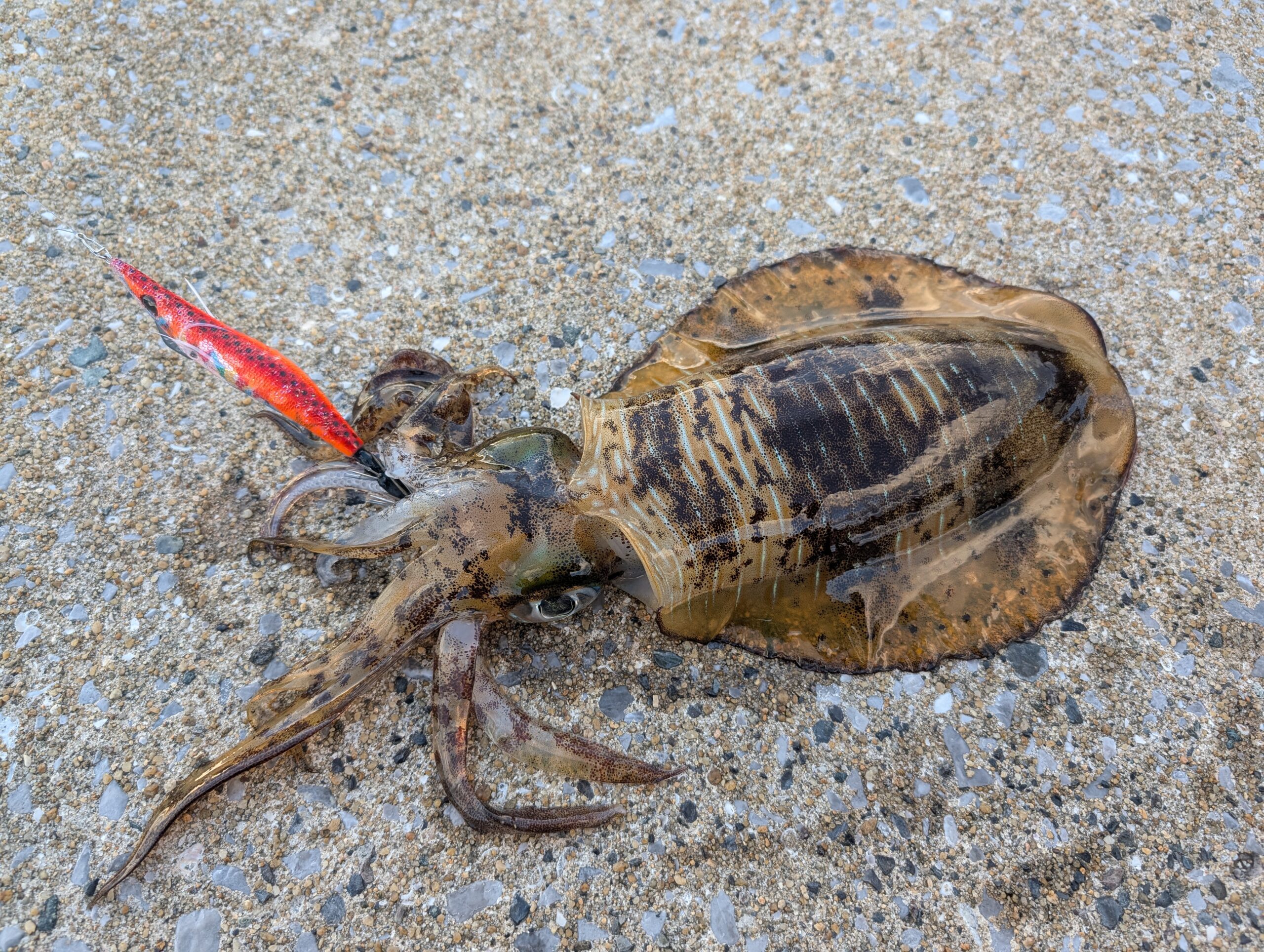 出張やらで久々のエギングへ! 状況も分からないままとりあえず近場のポイントへ! 到着するも風、うねりがまあまああってやりづらい(T_T) それでも丁寧に狙ってやると子イカがヒット! 後は続かず、ランガンしながらポロポロ拾う感じてした。
