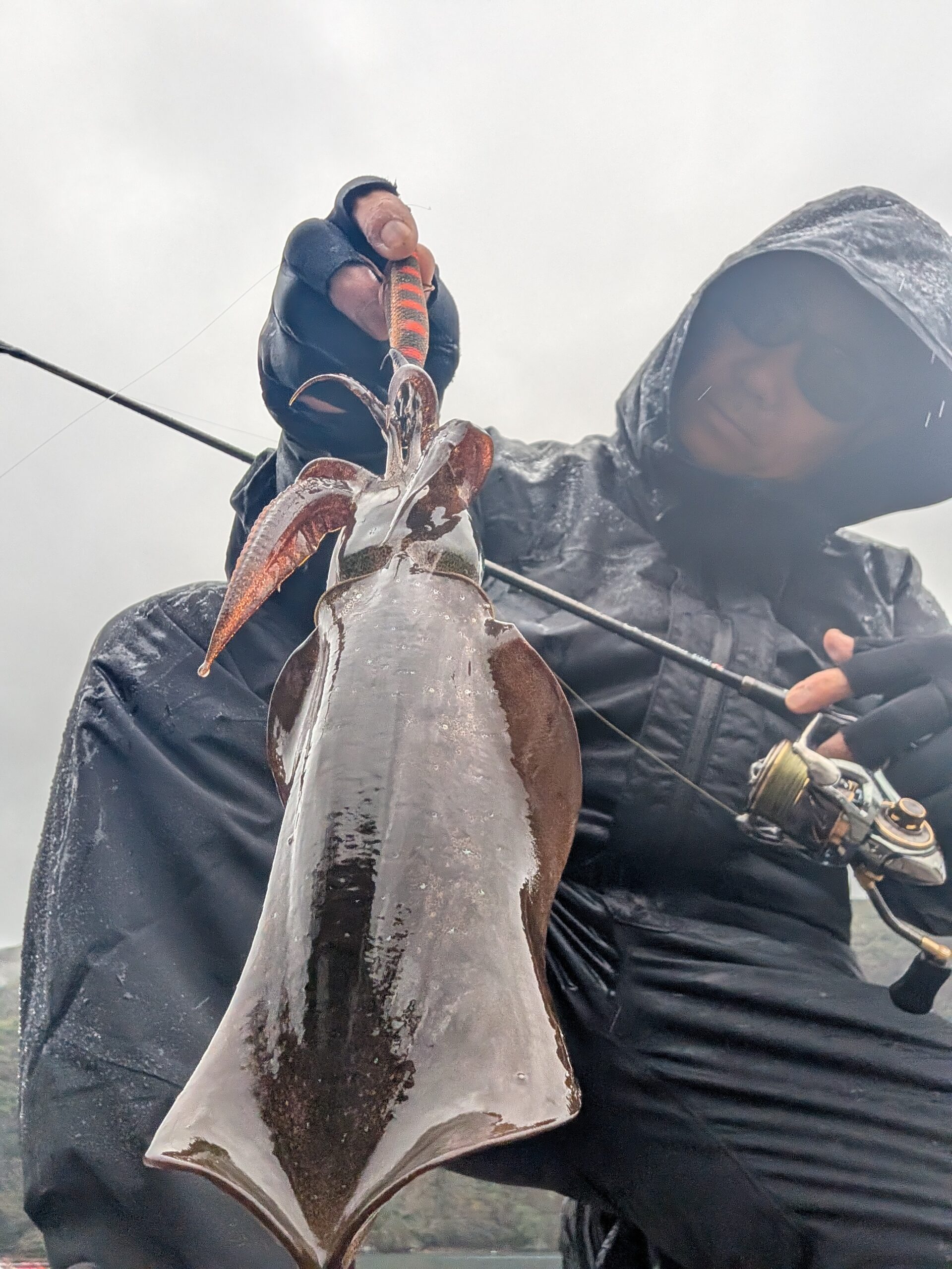や〜あけで久々の凪ですが、雨、明日からはまたまた荒れるということでおニューの防寒レインを着て出撃!!! 到着して1か所目からイカ発見!!しかしかんなり食い気なし(汗)移動し活性のいいイカを探しながらのランガン! ようやく活性の高いやつを見つけて連発!!! 夜に向けていいアップができました!