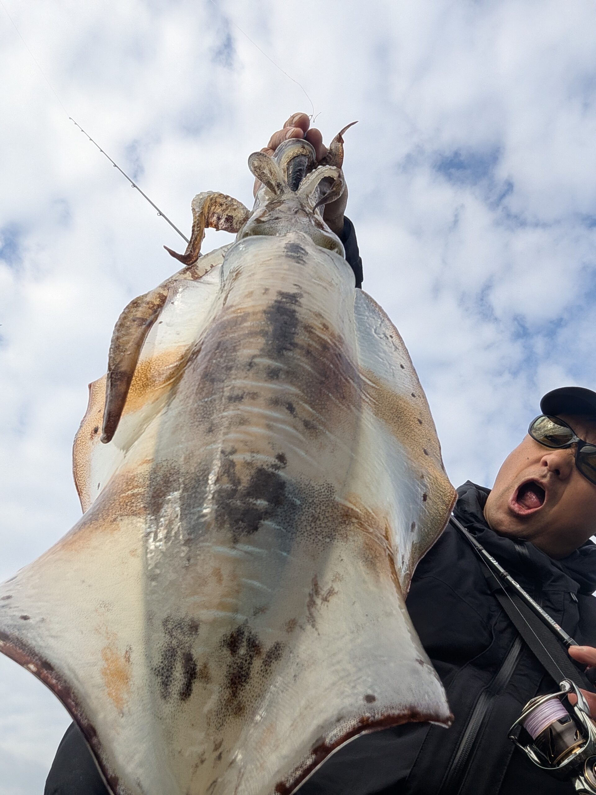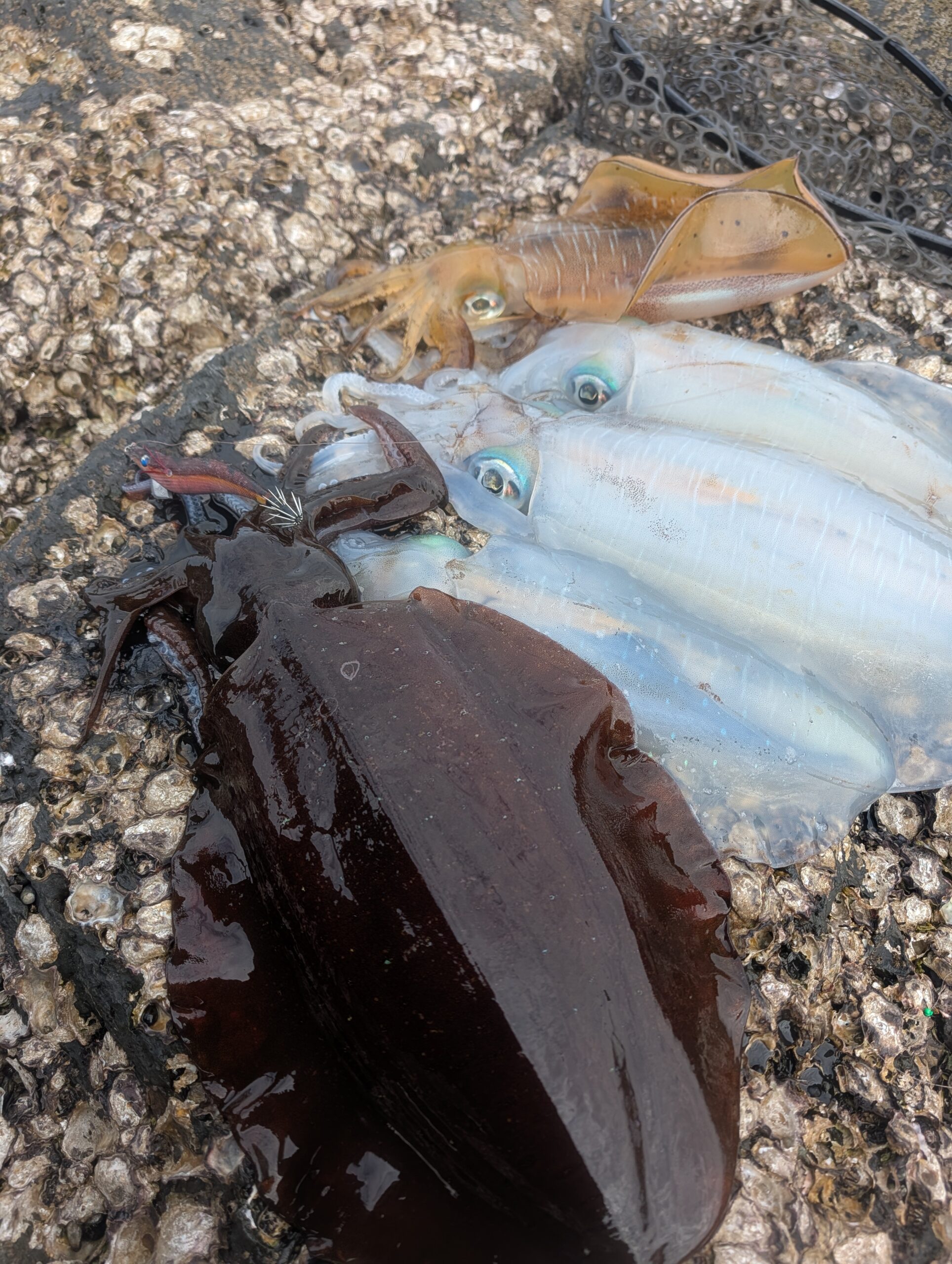 夜勤あけで昼からエギング! 少し曇っており、風もまぁまぁの爆風(T_T) 始めは堤防でやりましたが、子イカのみ……。 潮が引き始めて地磯にのって釣り開始!!時合突入で連発、連発!!!!!! 1,800㌘頭に型、数ともに満足の1日となりました!!